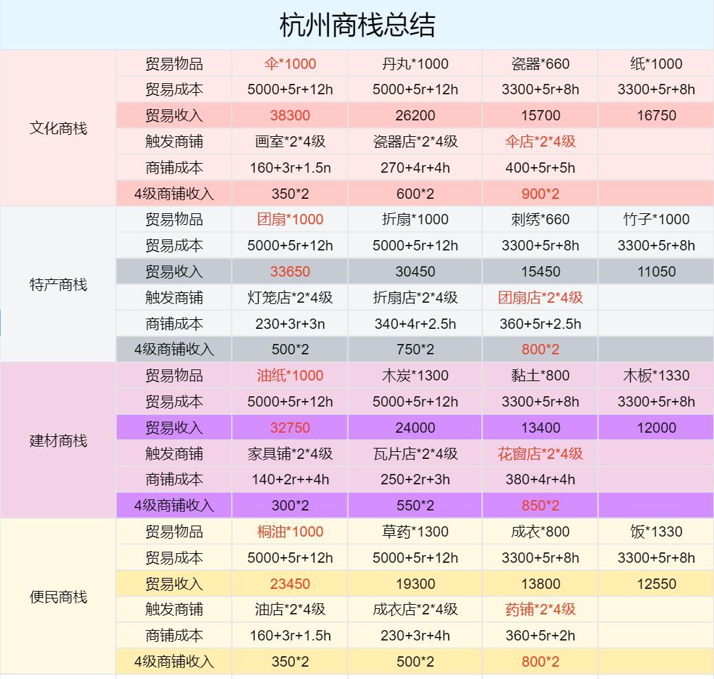 在江南白静地图这款游戏中,虽然水运开通后刷杭店不那么流行了,但还是有一定的好处的。下面是四家店的营收、成本、触发店以及杭州店必备地图。