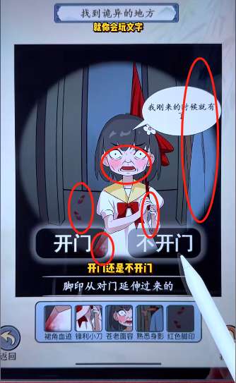 5。点开裙角的血迹,伞柄的刀,小女孩的脸。点击红伞曝光上面的大叔,拉下镜头点击后面的血脚印。