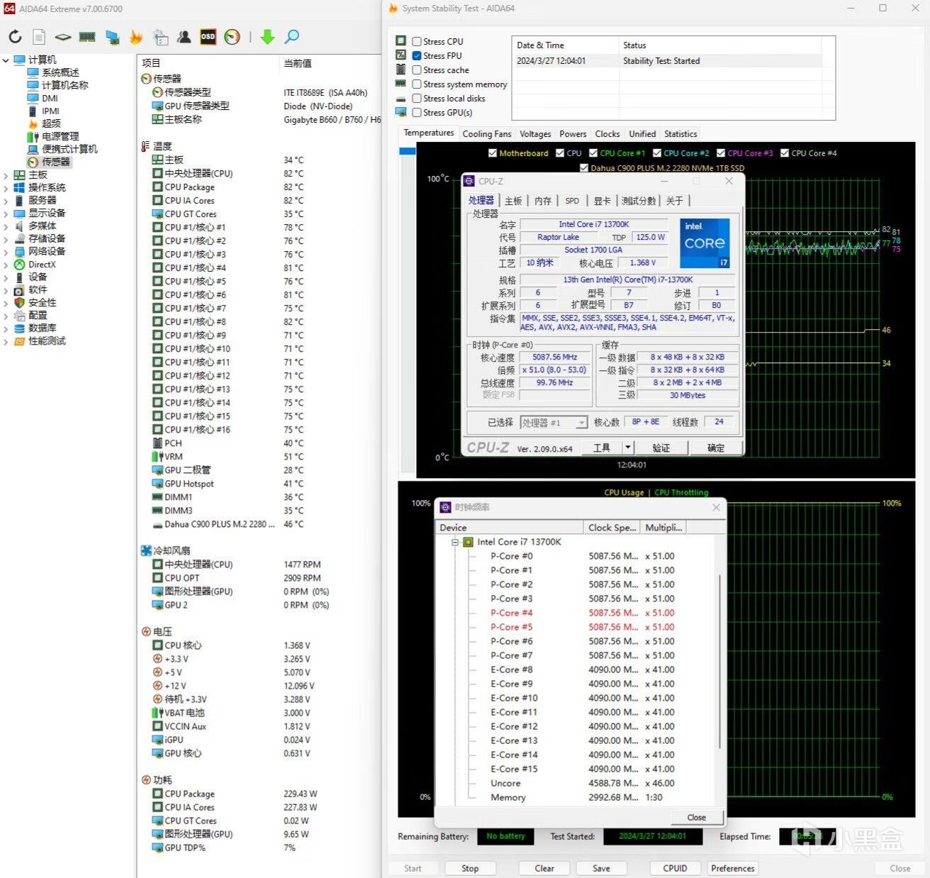 ▼单烤FPU测试,处理器功耗约230W,温度约82℃,南桥40℃,电源51℃,显卡核心28℃,固态46℃。机箱内部散热出色,风道顺畅。