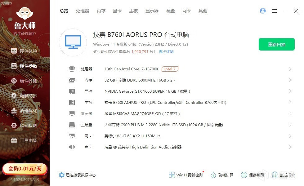 ▼整机配置概述:处理器为13700K,主板为技嘉的B760I,显卡为微星的GTX1660Super魔龙。