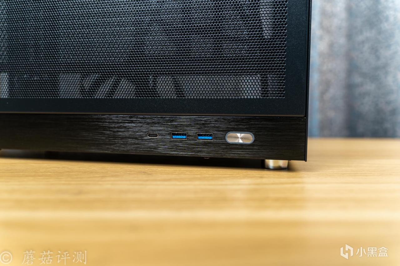 ▼机箱底部有一个长长的挡板,表面是拉丝的,看起来很不错。右下角是机箱的IO面板。除了开机键外,还有两个USB 3.0接口和一个Type-C接口。