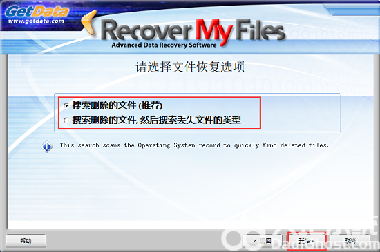 3.进入恢复我的文件软件文件恢复界面,如下图所示。有两个选项:搜索已删除文件和搜索已删除文件,然后搜索丢失的文件。在这里,我们选择推荐的选项,然后单击开始。
