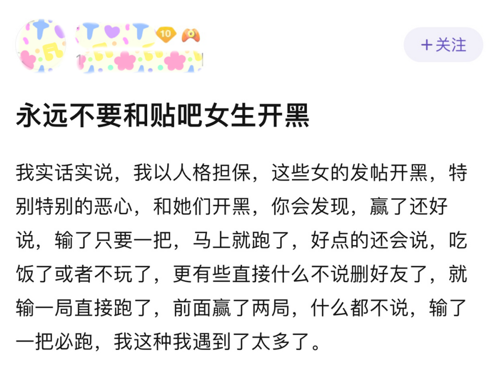 某玩家吐槽:“千万别和贴吧的女玩家一起开黑,不然你会后悔!”某玩家吐槽:“千万别和贴吧的女玩家一起开黑,不然你会后悔!”2023-01-28 08:45:25 -
