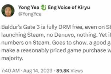 (话题)没有D加密!《博德之门3》仍能吸引大量玩家购买正版近日,海外游戏博主@YongYea(桐生新的英配声优)在社交平台表示,即使《博德之门3》没有D加密,仍能吸引大量玩家购买正版。值得一提的是,《博德之门3》在Steam平台的在线人数已突破872023-08-14 19:51:58 -