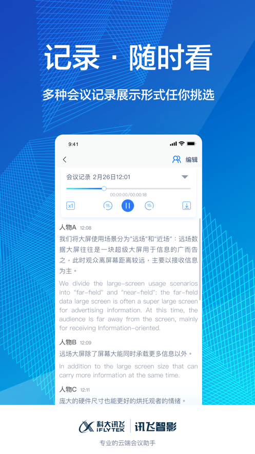 讯飞智赢软件操作简单方便。使用中可以编辑各种会议记录和学习记录,支持导出、获取、分享等各种专业实用功能。它还支持管理和导出各种文件等功能。快来下载体验吧。