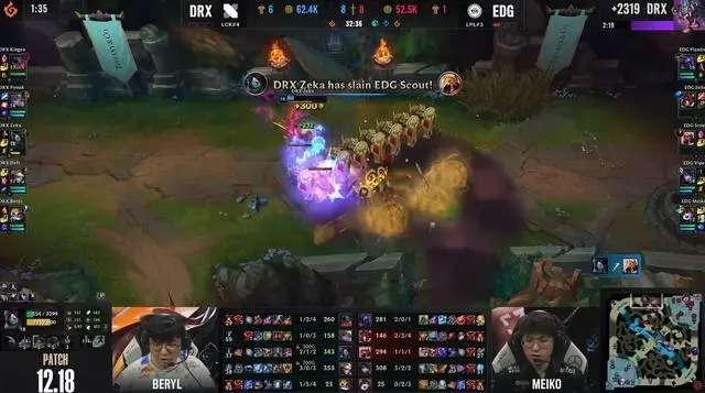 32分钟后,DRX再次冲向大隆。洁洁猪进场时,未能接住大龙,被杀。DRX通过无解操作和视野挤压把经济推到1W,然后Scout和泽卡去帝都PK,泽卡一个人吃饭。