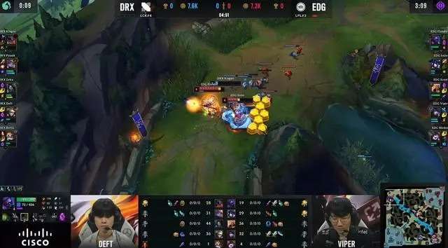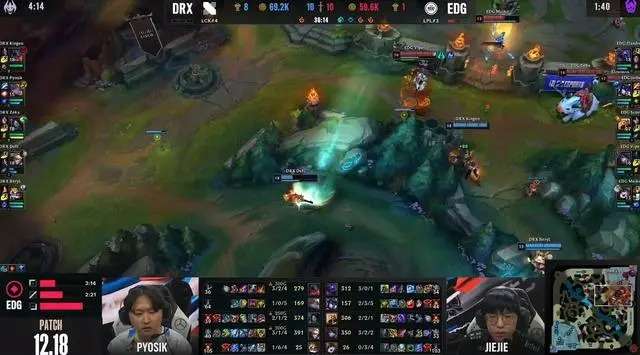 36分钟,毒蛇单飞,埃皮修斯绿刀Q先命中。然后,大风的海报脸Deft在一秒钟内掉落Deft,帮助EDG取得了人数优势,将其推回到DRX中路的一座塔上。这是EDG在游戏中提到的第二个防御塔经济。