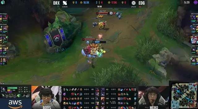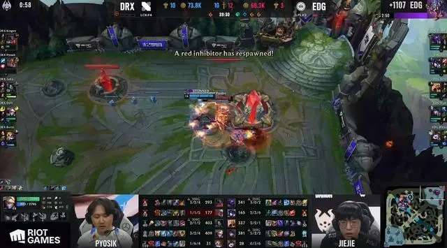 在后续的比赛中,双方大打出手,DRX不停的偷房子,甚至拉出了EDG的上下高地。双方不停地拉拉扯扯,交换着脑袋。虽然EDG得到了龙魂,但房子里没有多少建筑。