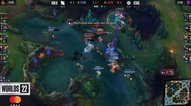 之后,DRX继续用5比1防御塔带来的巨大视野碾压EDG野区。29分钟后,EDG先是多次闪现DRX,然后挤进龙坑拿下平局火龙,最后面对剑魔的双包有序撤退。