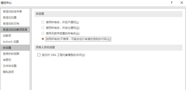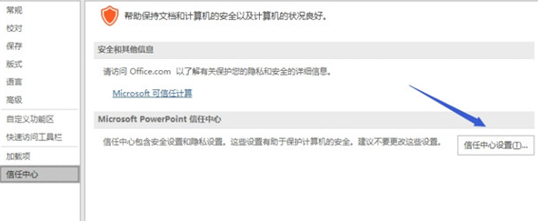 2.选择“信任中心”,然后单击“信任中心设置”。
